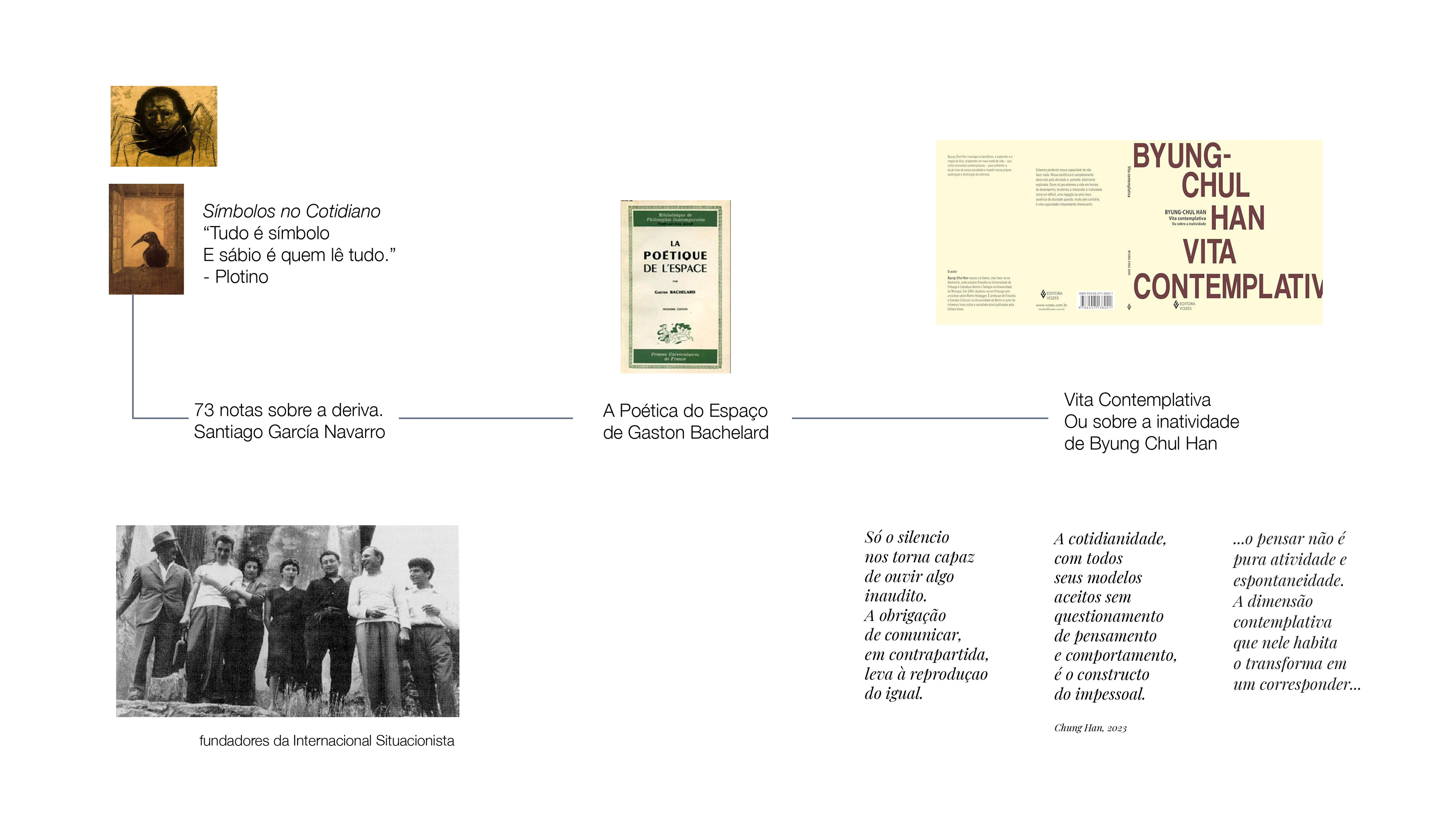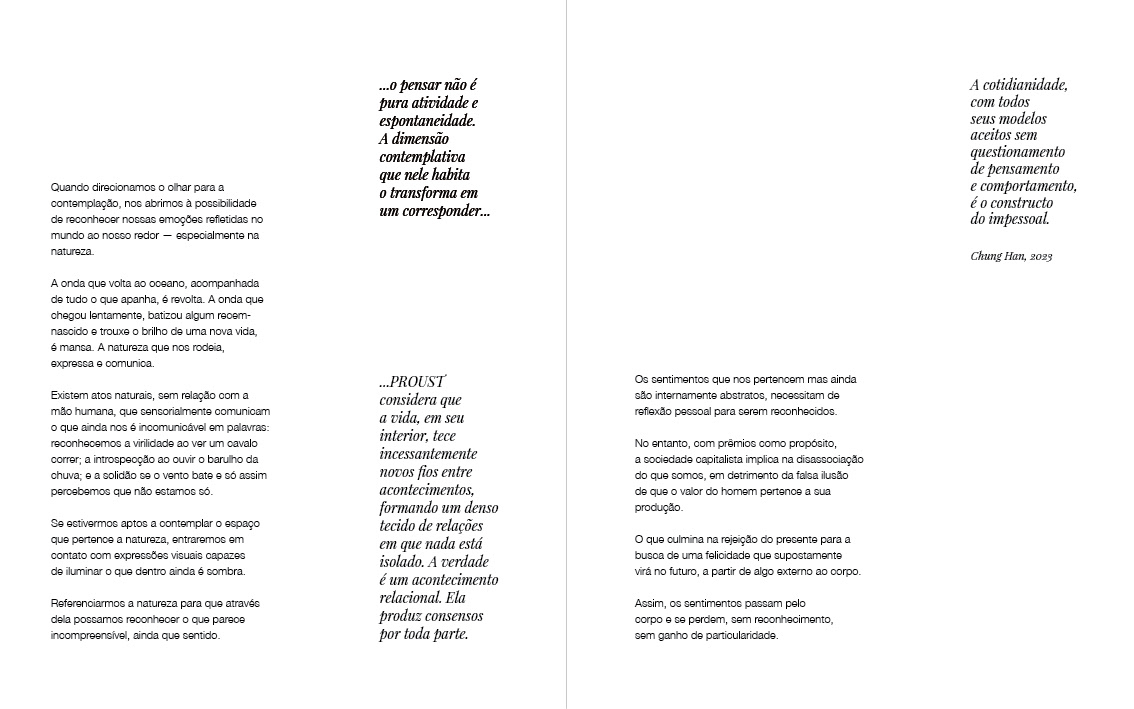 SOCIETY: Critique of structural problems that hinder contemplation. NATURE: Possibility of contemplating nature as a tool for self-knowledge. FEELING: Presence and assimilation of what is felt.